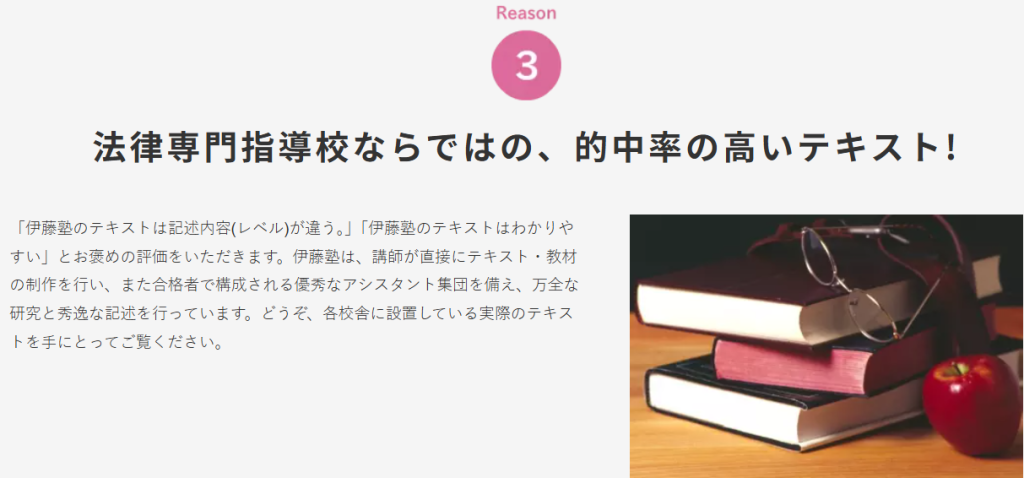 伊藤塾はテキストの質が高いのが特徴で、特に的中率に自信を持っている点が特筆点でしょう。