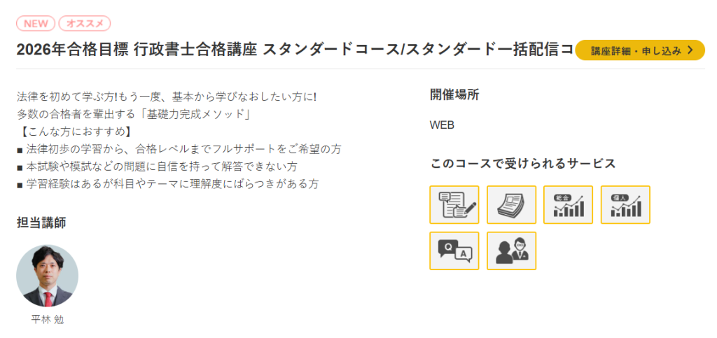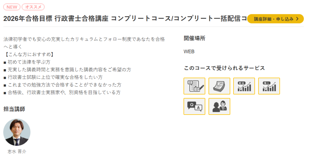 多数の法律家や行政官などを輩出してきたバックボーンも相まって、行政書士について真剣に考えたい方に向いている講座だといえるでしょう。