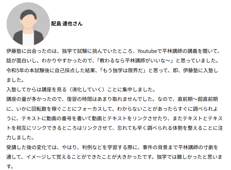 SNS上でも平林講師への好評が多く見られますが、伊藤塾の公式HP上では、さらに具体的に講義の様子を語る評判が見られます。