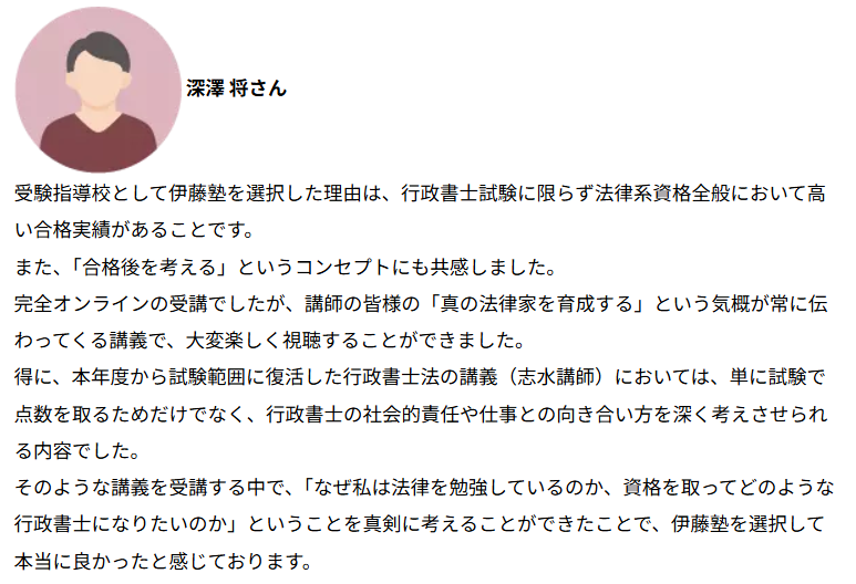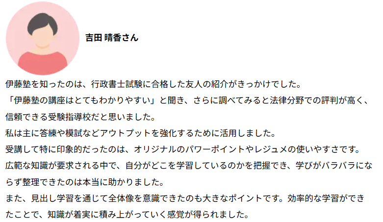 実際に、伊藤塾の行政書士講座を受講して合格した受講生からは「講義のわかりやすさが全然違いました」という評判・口コミを多く出ています。