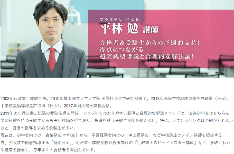 特に平林勉講師は公式HPでも確認できるほどに評判高く、講師陣が作成する教材は試験での的中率も含めて評判も高い点が強みです。