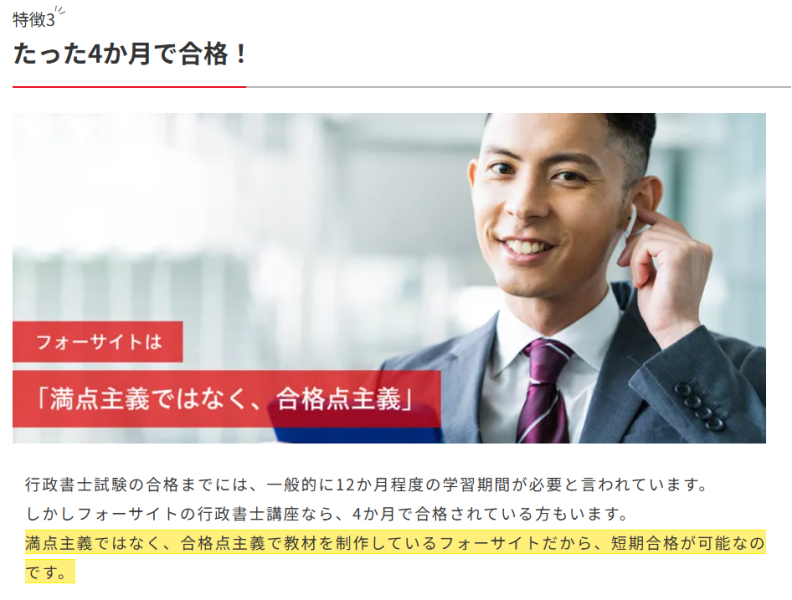 フォーサイトの行政書士講座は満点ではなく合格点を目指すことで、最短4ヶ月での合格を目指す合格点主義を採用しているのが特徴です。
