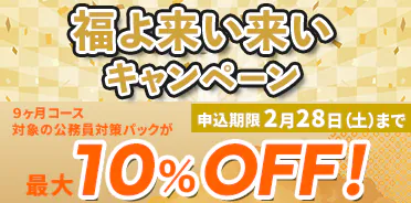 | 福よ来い来いキャンペーン(2/28まで) | 通常版:受講料8,800円OFF~ 合格フルサポート版:受講料10,000円OFF~ | 9ヶ月コース(通常版/合格フルサポート版) 総合対策パック 社会人総合対策パック 大卒教養対策パック 社会人大卒教養対策パックなど |