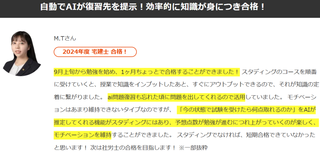 実際にM.Tさんも、AI機能を利用できるスタディングでなければ、一ヶ月での合格はできなかったと述べていました。