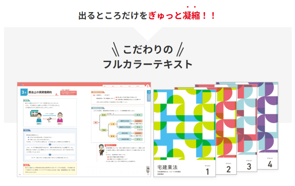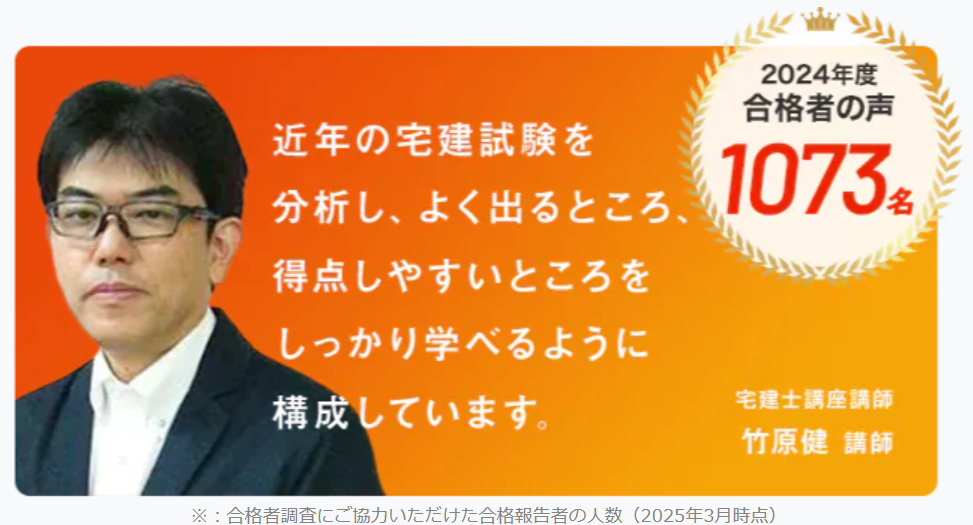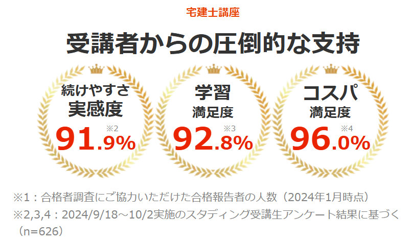 優良な講義・テキストを用いつつ、圧倒的支持を受ける竹原講師の指導を存分に受けられるのが、スタディングの宅建講座の特徴です。