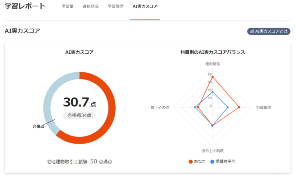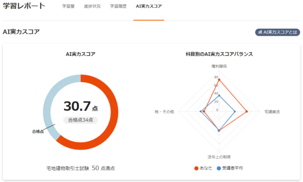 さらに受講生の実力も、AI実力スコア機能によって、現状の実力で宅建試験を受けた際の予測スコアを分析可能です。