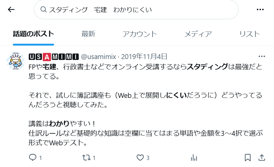 スタディングの宅建講座は優秀な宅建講座ですが、経験者には物足りないのではないかという声がSNSを中心に挙がっていました。