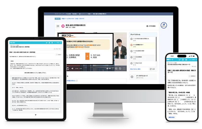 スタディングの司法試験・予備試験講座は、徹底したオンライン最適化により、スマホ一つで講義動画、WEBテキスト、問題集、暗記ツールなど全ての学習が完結します。