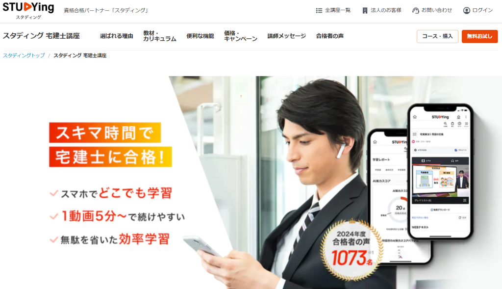 スタディング14,960円〜非公開△(有料:1枚1,500円~)最安値・スマホ完結・AI復習