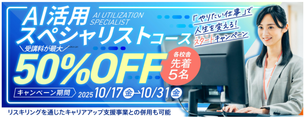 ヒューマンアカデミーでは現在、AI活用スペシャリストコースの受講料が50%OFFになる「学習応援キャンペーン」を実施中です。