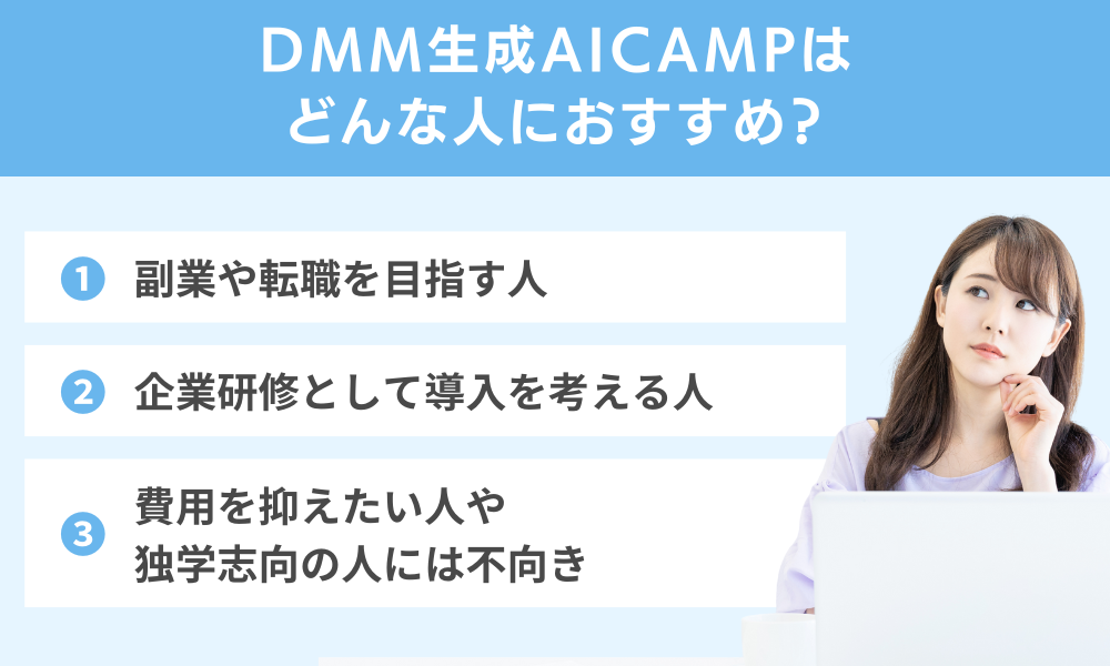 ✓ DMM生成AI CAMPの特徴と、どんな人に向く/向かないか