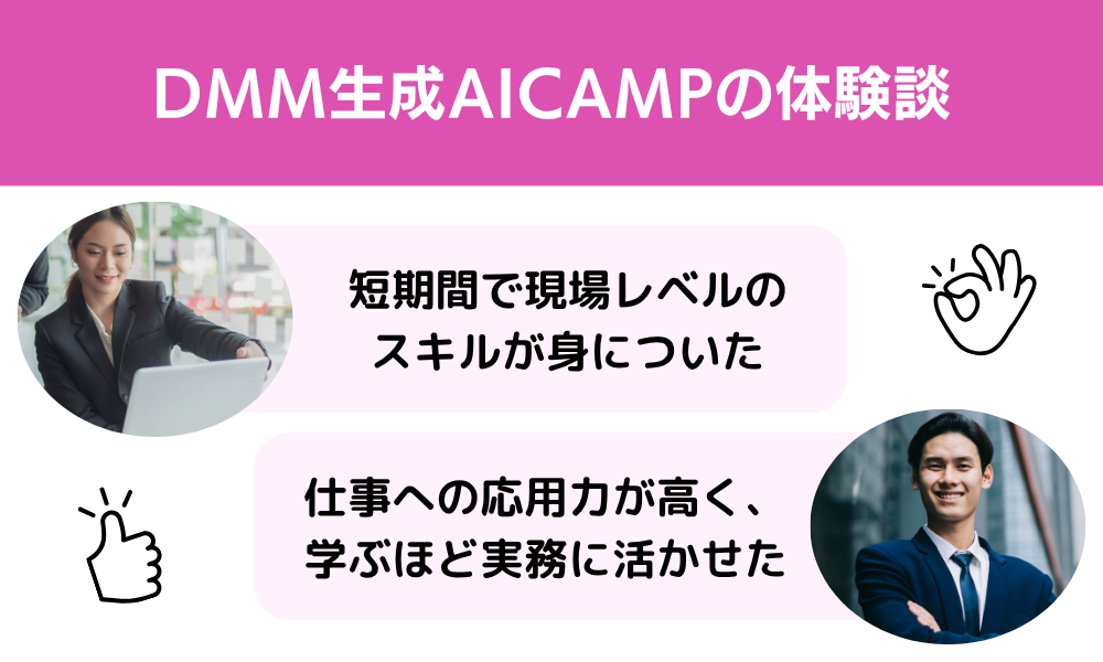 ここからは、受講者が実際に感じたDMM生成AI CAMPの良い評判を、具体的な体験談とともに紹介していきます。