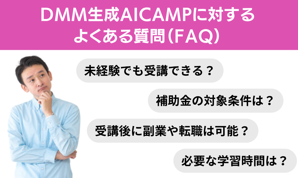 DMM生成AI CAMPについて調べていると、「未経験でも大丈夫?」「補助金の条件は?」など、受講前に知っておきたい疑問を持つ方が多く見られます。