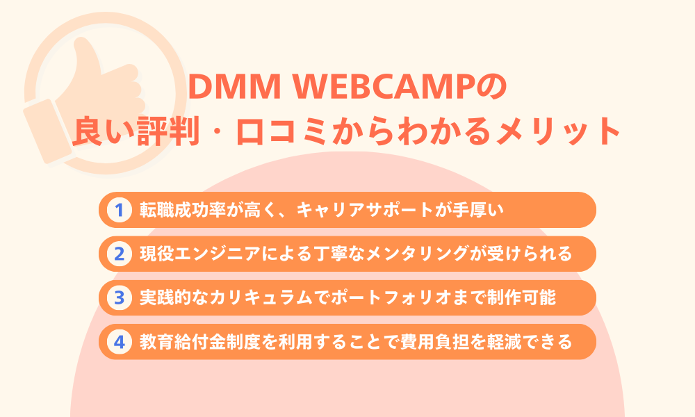 口コミからも、DMM WEBCAMPは転職成功率の高さや現役エンジニアによる手厚いメンタリング、実践的なカリキュラム、そして給付金制度の活用による費用面でのメリットが評価されています。