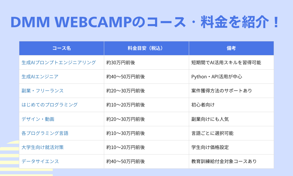 DMM WEBCAMPの費用は、受講するコースによって大きく異なります。