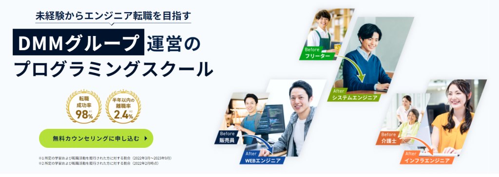 DMM WEBCAMPは、未経験からでもエンジニアやWebデザイナーを目指せるプログラミングスクールです。