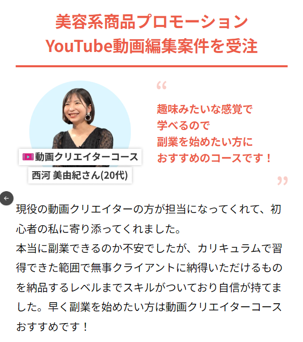 単なる知識のインプットにとどまらず、実践を通じて成果物を形にできるカリキュラムは、即戦力を求める企業からの評価にも直結しており、転職や副業を目指す人にとって大きなメリットといえるでしょう。