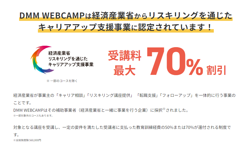DMM WEBCAMPは、経済産業省が推進する「リスキリングを通じたキャリアアップ支援事業」の対象講座に指定されています。