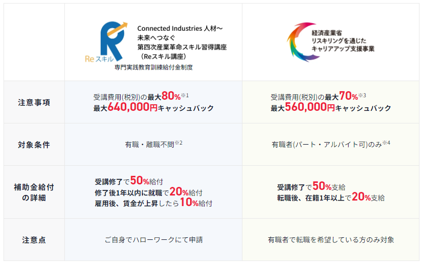 具体的には「リスキリングを通じたキャリアアップ支援事業」や「Reスキル講座認定制度」といった公的制度の対象コースがあり、最大で受講料の70%が支給されます。