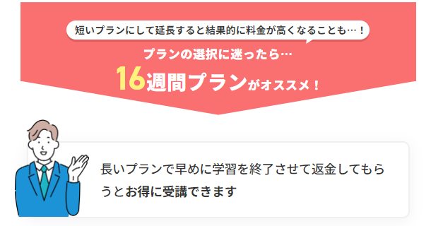 学習の進み具合によっては、残りの受講期間に応じた金額が返金されるため、効率的に学習を終えた人にとっては費用の負担を抑えられる仕組みです。