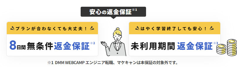 はい、DMM WEBCAMPには複数の返金保証制度があります。